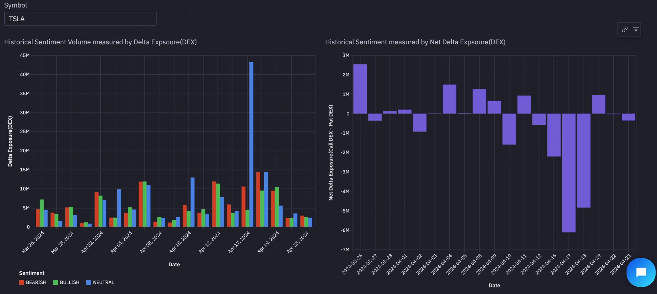 On TradingFlow Full Option Flow page, you can view DEX data based on stock codes to obtain sentiment, call, and put data quantified by DEX.