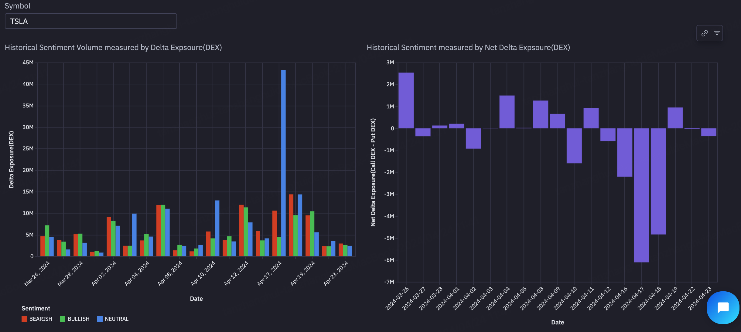 <figure><img src="https://content.gitbook.com/content/G4P2NcvxCl7OpMaE4mWb/blobs/WCOl9BIdXYLyew5ElvYM/image.png" alt=""><figcaption><p>Historical sentiment activity for TSLA options, visualized using Delta Exposure (DEX). The left chart shows daily volume segmented by bullish, bearish, and neutral sentiment. The right chart displays Net Delta Exposure (Call DEX - Put DEX), highlighting shifts in overall market sentiment — with positive bars indicating net bullish pressure and negative bars reflecting net bearish sentiment.</p></figcaption></figure>