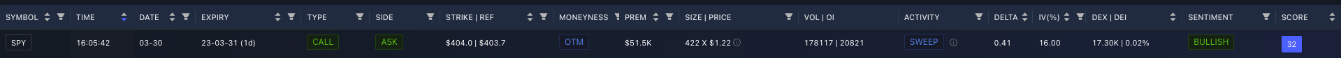 <figure><img src="https://content.gitbook.com/content/G4P2NcvxCl7OpMaE4mWb/blobs/hEUGvsAyqke1kasMhxJ5/image.png" alt=""><figcaption><p>This SPY call trade on 03/30/2023 illustrates how Delta Exposure (DEX) quantifies directional risk. With 422 contracts at a delta of 0.41, the DEX is 17.3K—meaning the trade behaves like buying 17,300 shares of SPY. If this is an opening position, the dealer would need to hedge by buying 17.3K shares to stay delta-neutral.</p></figcaption></figure>