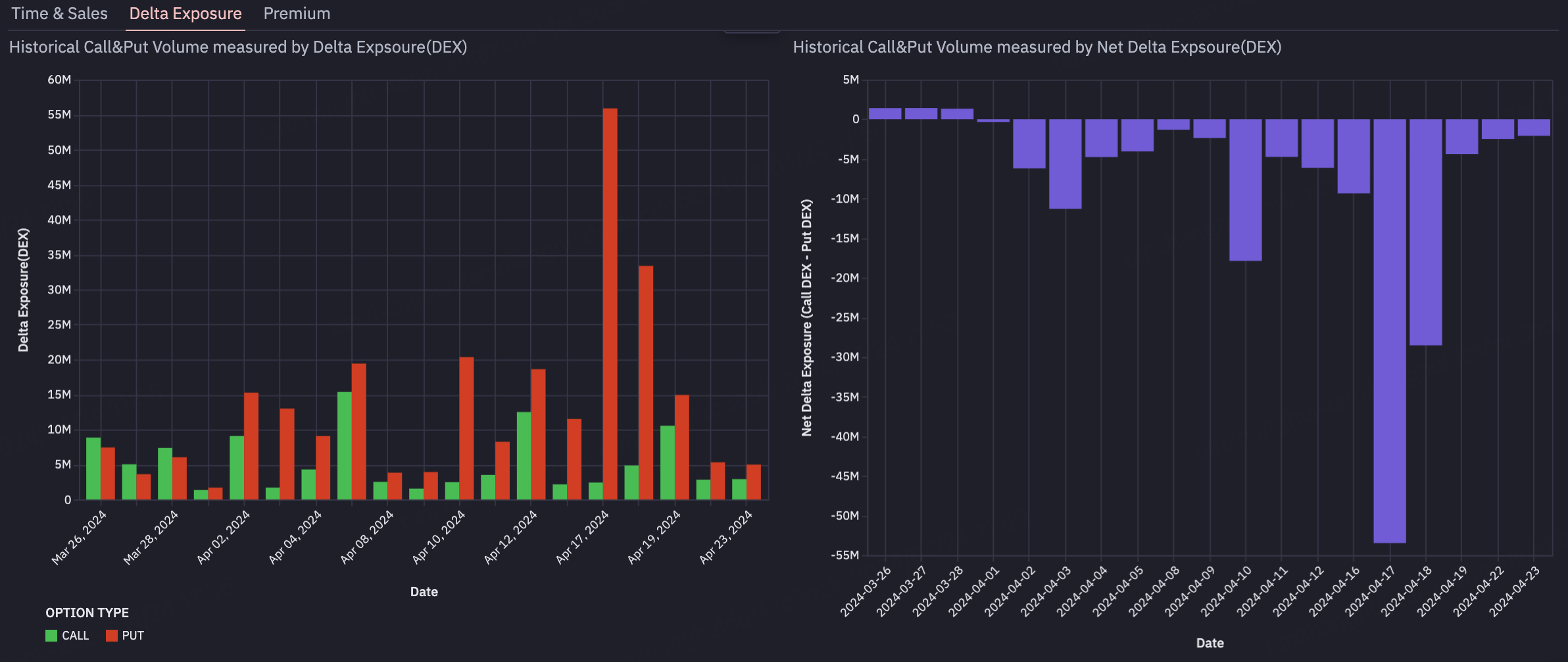 <figure><img src="https://content.gitbook.com/content/G4P2NcvxCl7OpMaE4mWb/blobs/k3p5rNHb12eFtZmJFcPj/image.png" alt=""><figcaption><p>Call and Put option activity by Delta Exposure (DEX). Left: Daily DEX volume split by call (green) and put (red) options. Right: Net Delta Exposure (Call DEX – Put DEX), highlighting sustained bearish pressure across the period shown.</p></figcaption></figure>