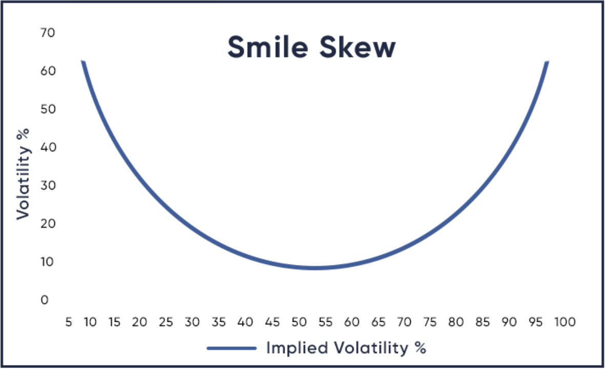The volatility smile is a pattern observed when plotting the implied volatility (IV) of options against their strike prices for a given expiration date. Instead of forming a flat line — as assumed by the Black-Scholes model — the plot often curves upward at both ends, creating a shape resembling a smile.