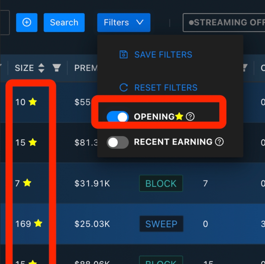The Opening filter highlights option flow that likely represents newly opened positions—not trades tied to existing contracts. It works by filtering for orders that: