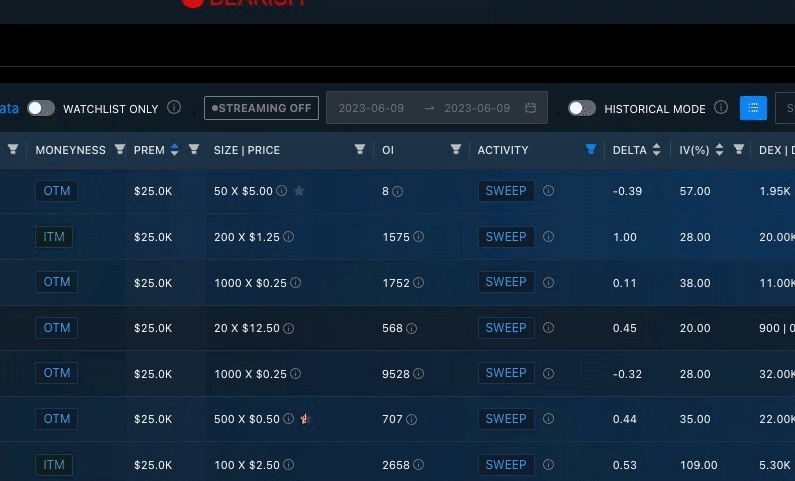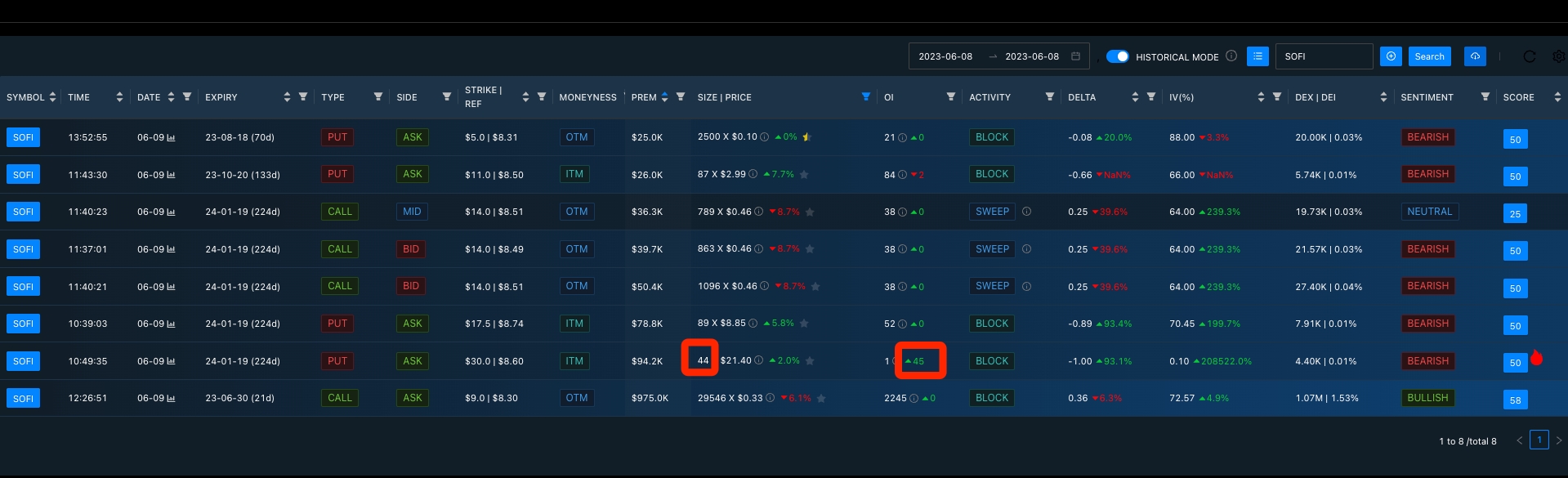 In this example from 06/08/2023, there’s a PUT option order for SOFI with a size of 44 contracts and an open interest of only 1—indicating the position is likely opening, since the order size exceeds the existing open interest.