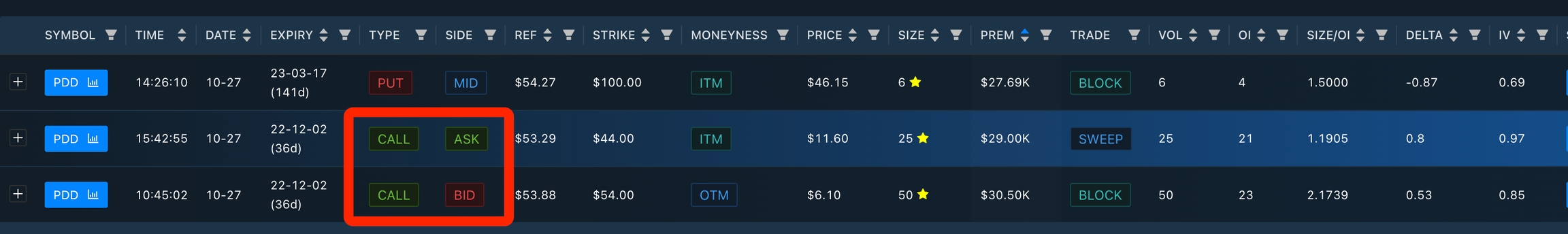 - For instance, If a call trade is executed at the ask, it likely means a buyer is aggressively taking the offer → bullish intent.