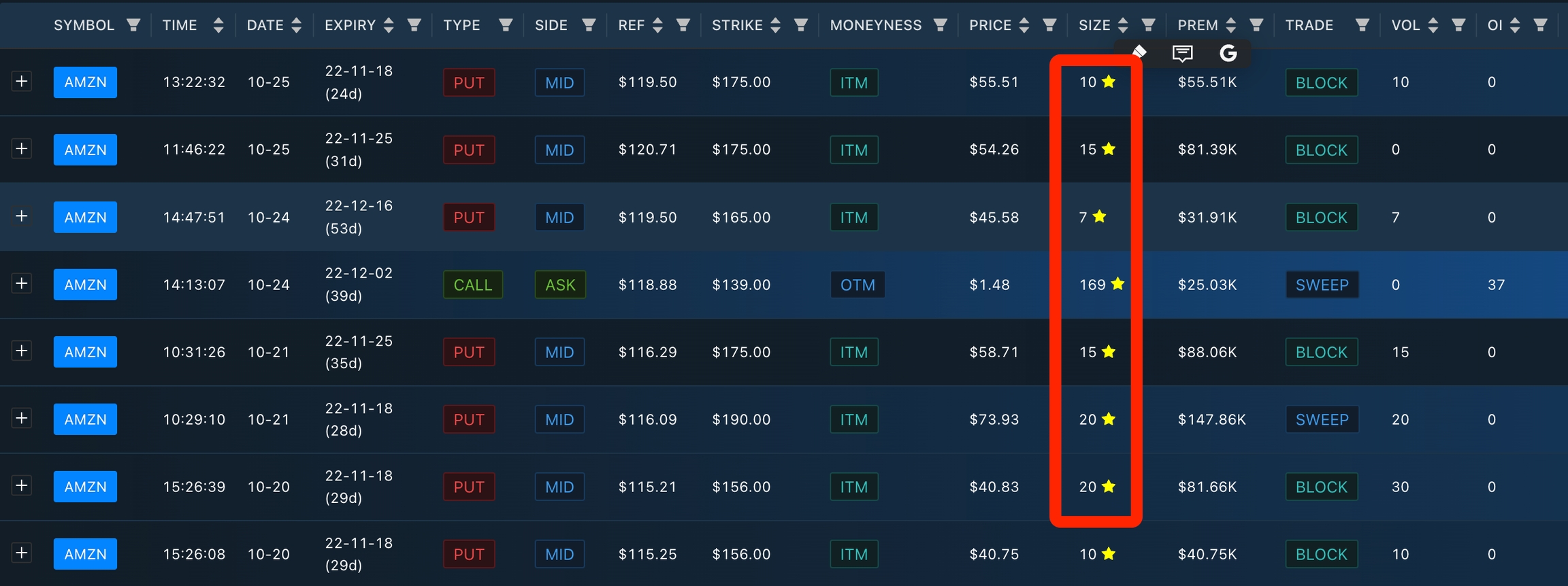 On Oct 27th,2022, Amazon shares plunged more than 20% after hours. If we search the options flow with the opening filter on, we can identify that traders placed orders on puts from Oct 20th to Oct 25, and these option contracts has 0 open interests, so those orders are all open to buy, which is very aggressive sentiment, so we can tell that this trader had solid confidence and placed a huge bet on that the AMZN will plunge after earning report for Q3.